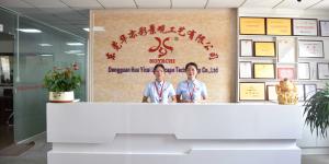HOYECHI manufacturer reception area with front desk and awards wall, showcasing factory credentials for outdoor lighted Christmas reindeer production